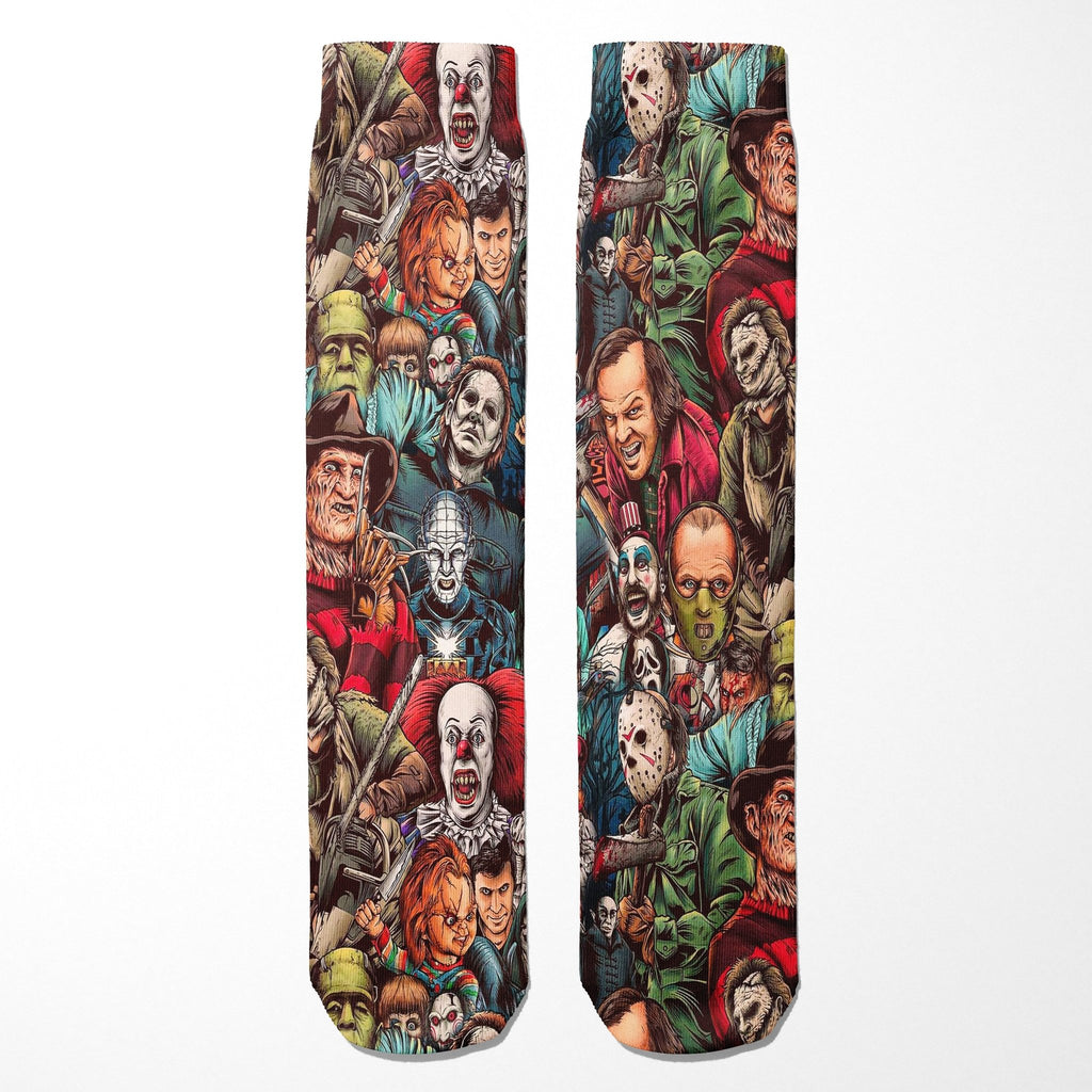 All the great and classic horror movie characters represented on a great pair of socks to show off your spooky side.