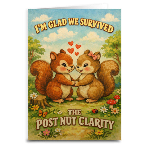 Real talk: the struggle is real. The Post Nut Clarity Card is for those couples who have made it through the most honest moment of any encounter and came out the other side still holding hands. Featuring a charming, vintage-inspired illustration of two squirrels in a meadow, it’s the ultimate "if you know, you know" message for your partner.