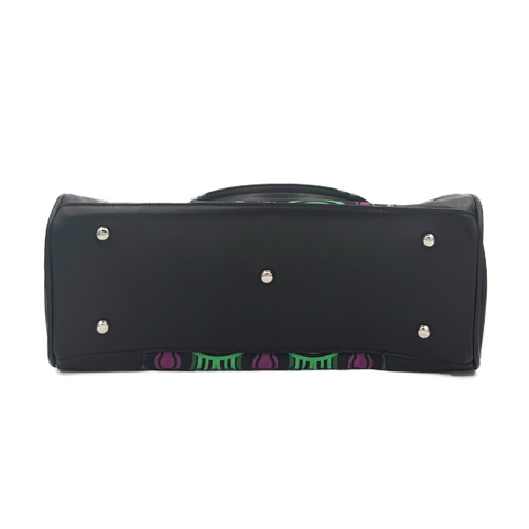 This classic Bowler has satin like sides, foam padding and premium zippers. It also features high quality faux leather on the bottom and middle, with metal feet to keep it protected, as well as an interior zippered pocket for valuables. Dimensions are approximately 14 inches wide and 10 tall.