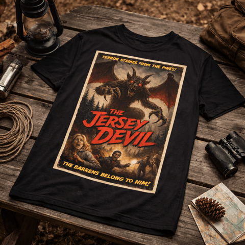Turn your wardrobe into a drive-in theater with the Jersey Devil Horror Movie Poster T-Shirt. This full-color design captures the thrill of a 1980s slasher flick, featuring the beast towering over terrified victims in the dark woods. With the tagline "The Barrens Belong to Him," it’s a cinematic tribute to New Jersey’s most enduring nightmare.